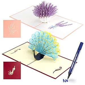 🎁【Rotulador gratis】Lo que obtienes: 1* tarjeta 3D del pavo real, 1* tarjeta 3D de la lavanda, 2* sobres de carta y 1* rotulador azul. Los colores de las tarjetas y el rotulador coinciden.SKU: n/a